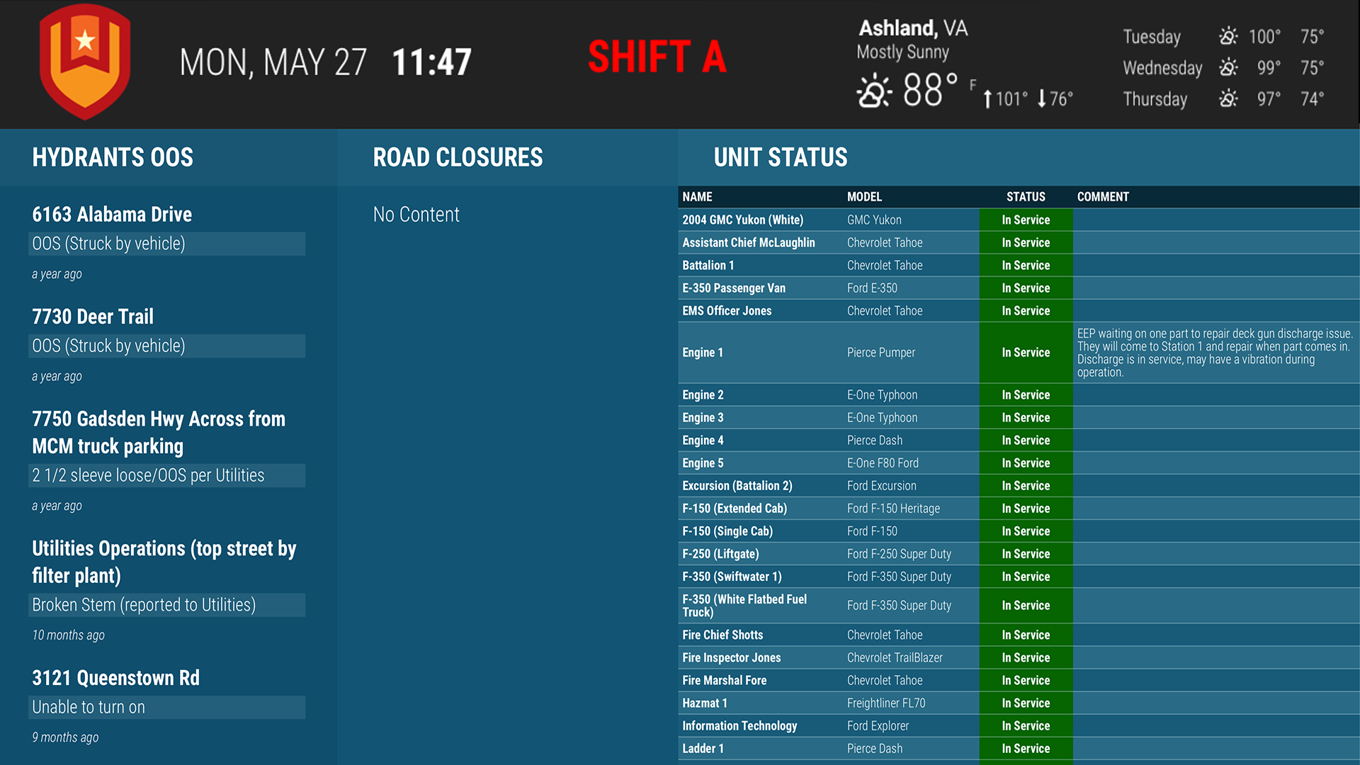 First Arriving's integration with Fleetio provides a great snapshot of your agency's fleet and statuses, directly on your Digital Dashboards.