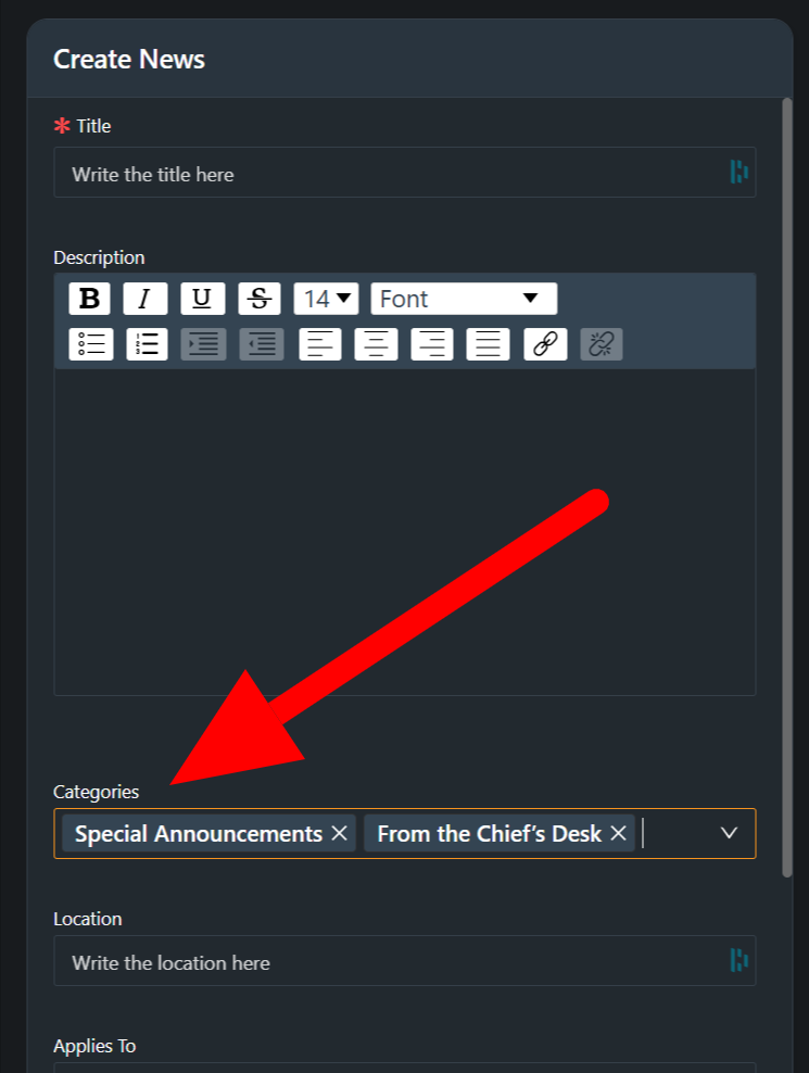 Once categories are created, Agency Admins and Content Managers can apply them when creating or editing content.