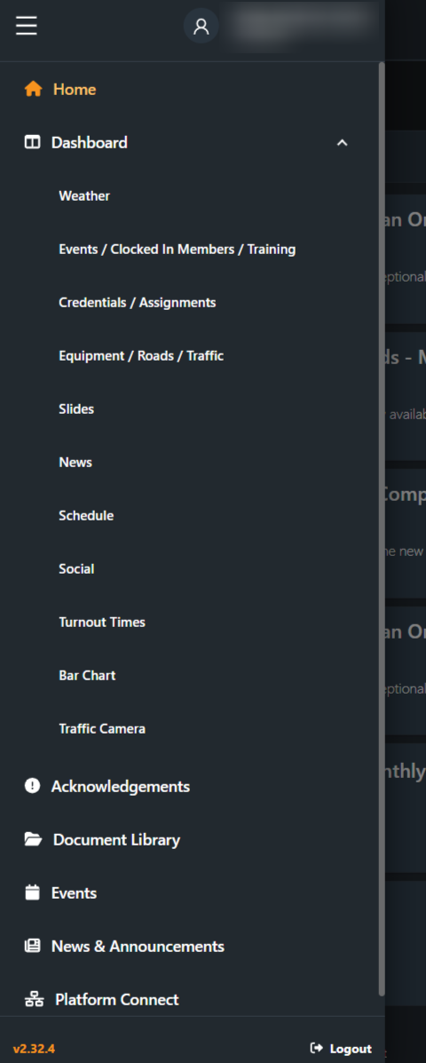 Mobile Navigation to Dashboards and User Account Features. Your Dashboard menu will vary based on your agency’s specific dashboard content.