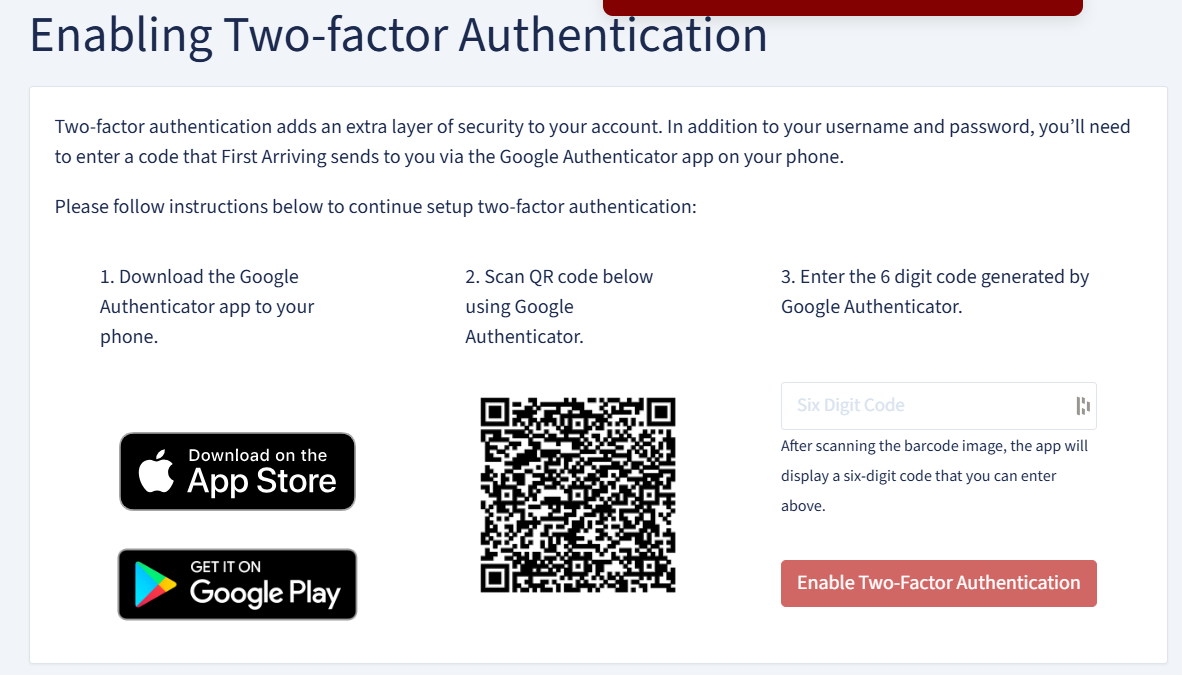 For added security, we strongly recommend enabling two-factor authentication (2FA) by clicking your profile icon, selecting My Account, and turning on two-factor authentication—this helps ensure your First Arriving account is as secure as possible.
