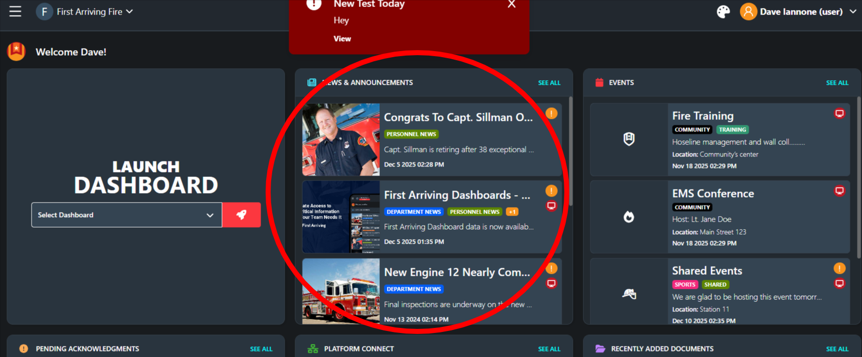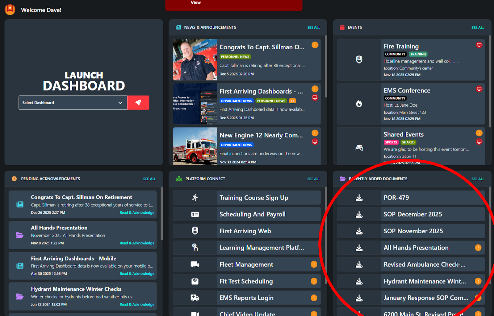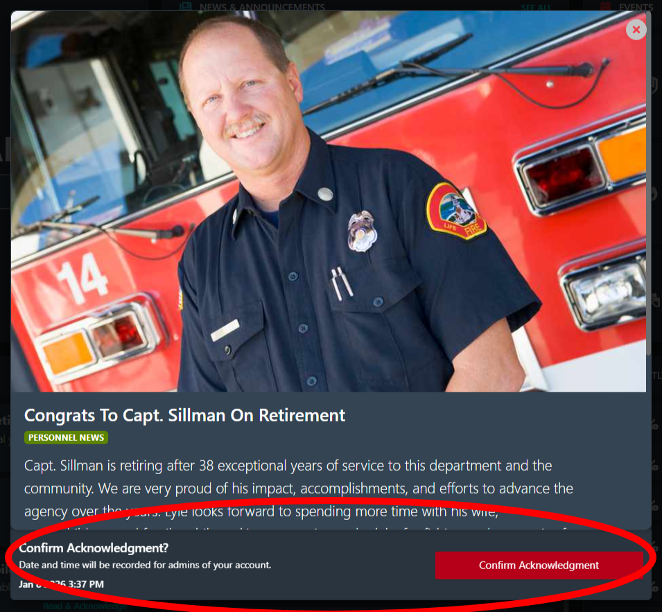 Depending on how your agency has configured the platform, your account may also require you to acknowledge specific items—such as policies, announcements, or events—to confirm they have been reviewed. This helps your department ensure important information is communicated effectively while giving you a clear view of what requires your attention.